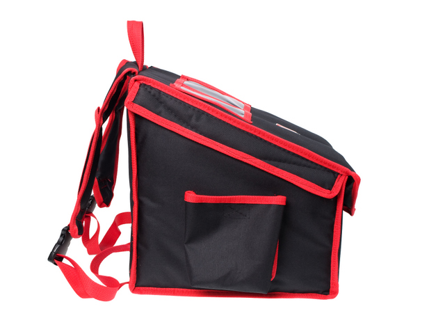 Verstevigd met een inwendig stalen frame. Eenvoudig handelbaar ook bij veel zijwind. Geschikt voor 4-5 pizzadozen + zak